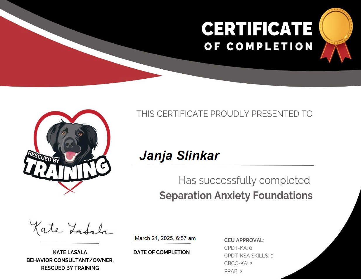 Da bi svoje znanje nadgradila, sem januarja 2024 začela študij na mednarodni šoli za etično vzgojo psov Nordic Education Centre for Dog Trainers. Poleg tega sem uspešno zaključila številne tečaje in seminarje, ki so me opremili z najsodobnejšimi metodami in pristopi za učinkovito delo s psi.