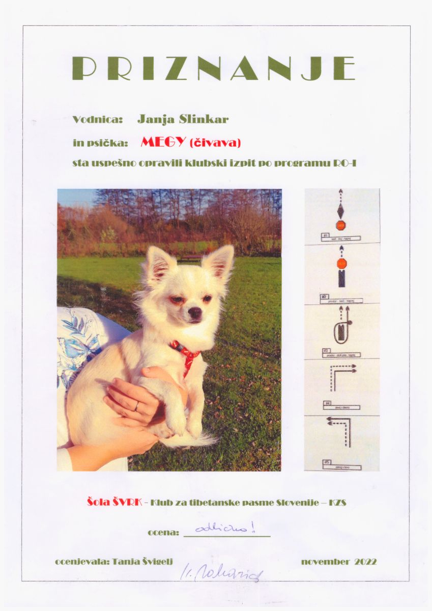Ljubezen do živali me spremlja že od malih nog, še posebej pa me navdihujejo psi. Leta 2021 je v moje življenje prišla psička Megy, ki me je popeljala globlje v svet kinologije. Skupaj sva se udeležili številnih tečajev – od tečaja za mladičke in B-BH tečaja, do treningov dela z nosom in Rally Obedience.